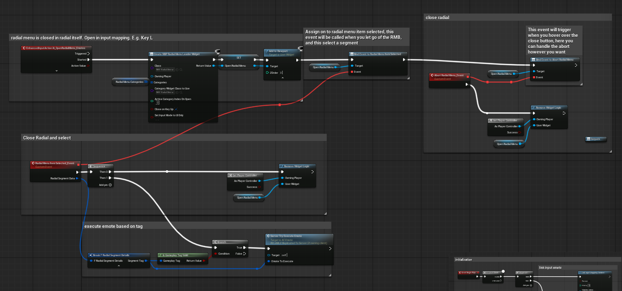 When the input action fires, the component creates the radial widget, supplies the prepared categories, adds the widget to the viewport, and binds two callback events: one for item selection and one for abort or close. When a segment is selected, the widget is removed, the segment tag is broken out of the radial segment struct, validated, and forwarded to the server-facing execute event.