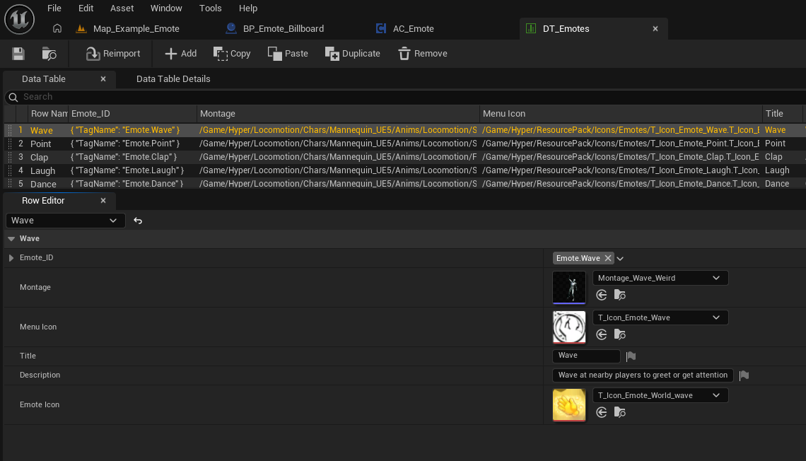 DT_Emotes is the source of truth for the system. Each row represents one emote and stores the tag, montage, menu icon, title, description, and optional world icon. In the supplied example, rows such as Wave, Point, Clap, Laugh, and Dance are all built the same way.