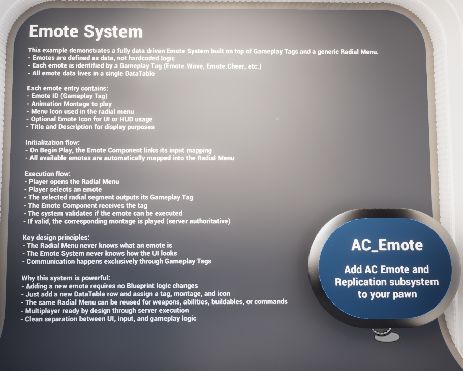 The Emote System is a clean example of a small but well-decoupled data-driven feature. DT_Emotes defines the available content, F_Emote packages the data, AC_Emote converts that data into radial menu entries and executes the selected result by tag, and BP_Emote_Billboard provides optional world feedback.