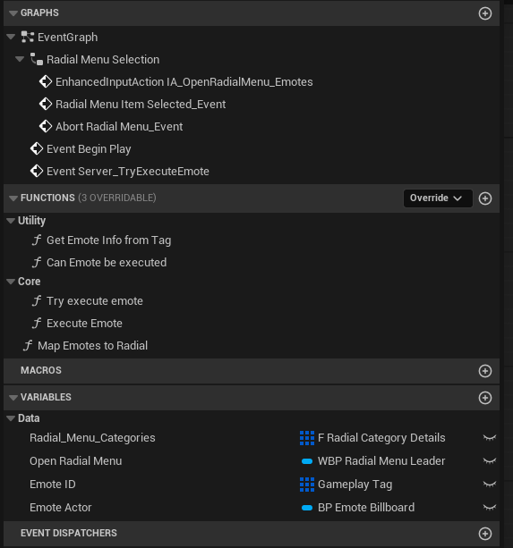 - Because AC_Emote rebuilds radial data from DT_Emotes, no new Blueprint branch is required for a basic emote.