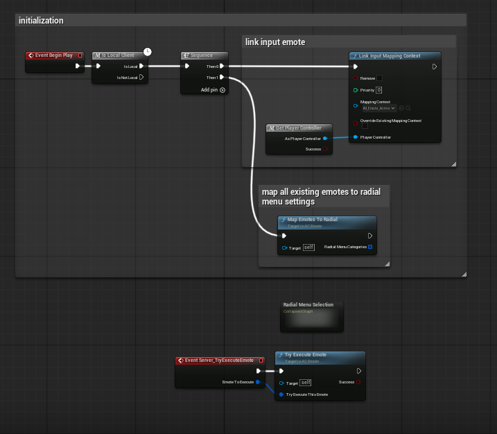 Initialization is intentionally small. On Begin Play, the component checks for the local client path, links the emote input mapping context, and immediately calls Map Emotes To Radial so the radial menu categories are ready before the player opens the menu.