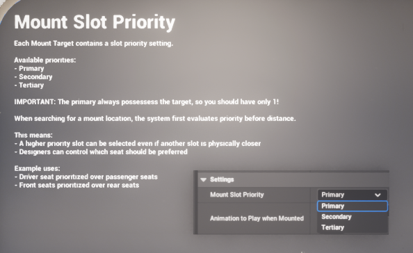 - Mount Slot Priority: decides which slot is preferred when multiple targets are available. The enum supplied with the system includes Primary, Secondary, and Tertiary.