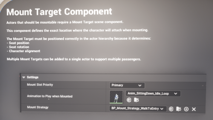 Any actor that should be mountable needs one or more mount target components. Each mount target represents a single usable slot. On a horse-like creature this may only be one rider position. On a truck or wagon there may be several independent targets for driver and passenger seats.