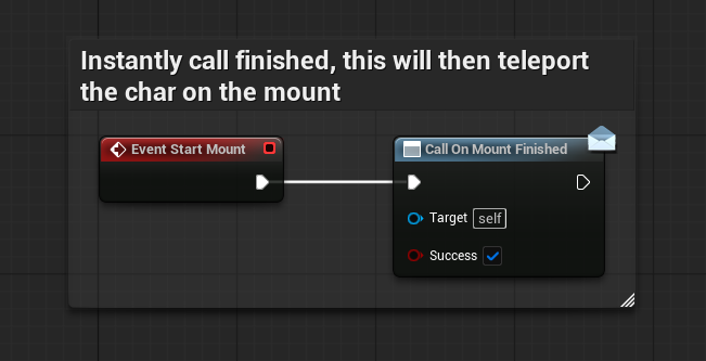 Assign BP_Mount_Strategy_Teleport to the slot. This causes the strategy to finish immediately, after which the main mount flow handles the actual attach and mounted state update.