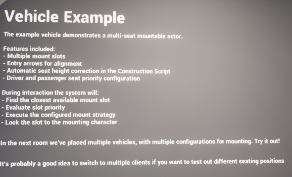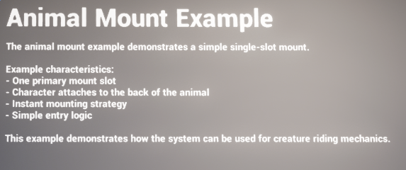 The animal example is a simple one-seat mount. One mount target is positioned on the creature, the rider is attached to that slot when mounting completes, and the designer can use either instant mounting or a small walk-to-entry approach depending on the feel they want.