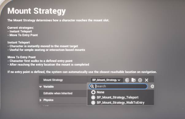 Assign BP_Mount_Strategy_WalkToEntry on the slot you want to use. Then make sure the mountable actor has sensible arrow components or a valid transform that can be reached on navigation. The strategy resolves a path, advances through its path points, and completes when the target location has been reached.