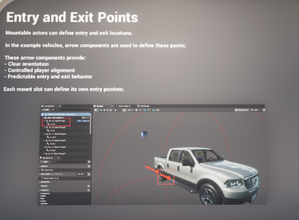 Mountable actors can define entry and exit locations using arrow components. These arrows give the system a clear world-space transform to move toward and a reliable facing direction for the final attach or detach result.