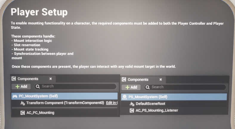 - Add AC_PC_Mounting to the Player Controller. This is the gameplay-facing component that receives mount and dismount requests, chooses a valid slot, starts the chosen strategy, and manages mounted input handling.