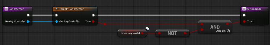 - Can Interact returns true only when the parent interaction path says the actor is valid and Inventory Invalid is false.