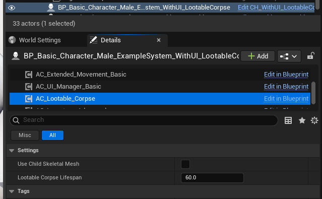 - 1. Add AC_Lootable_Corpse to the character Blueprint that can enter ragdoll.
