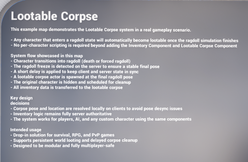 This document explains the Lootable Corpse system as supplied in the example implementation. It is written as buyer-facing technical documentation: what the system does, how the two Blueprints are split, how the spawn and interaction flow works, and what a buyer is most likely to want to customise.