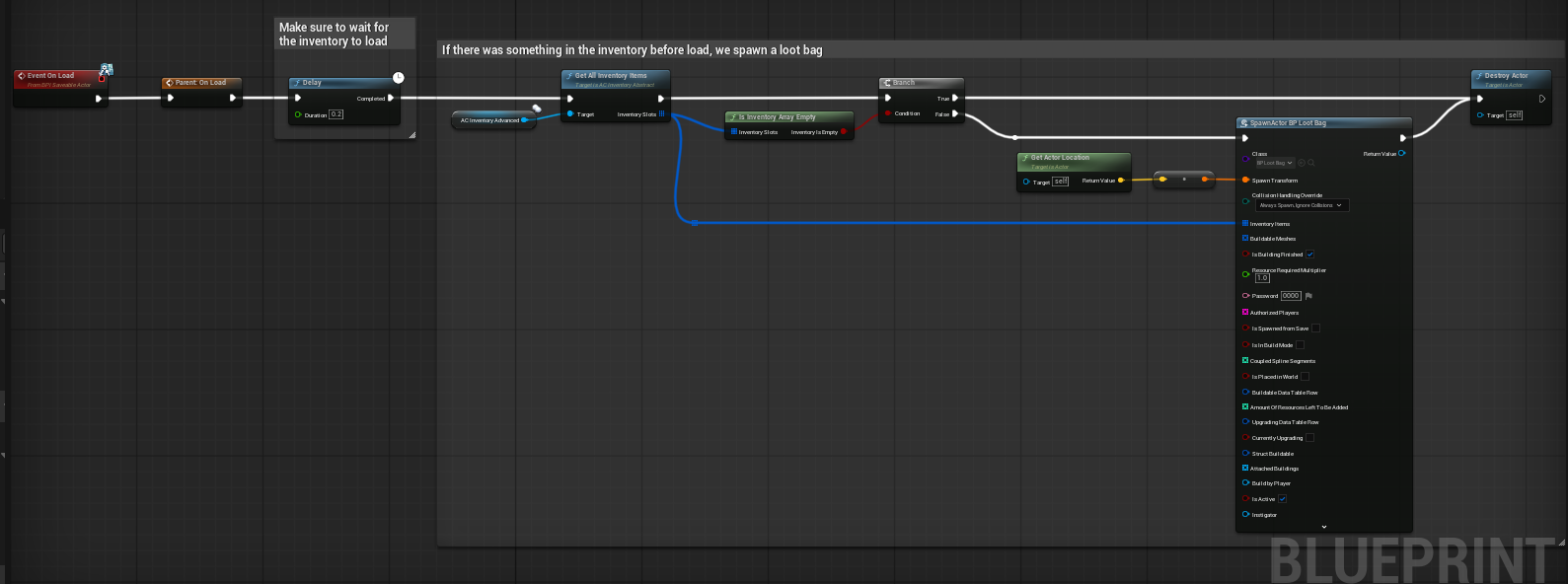 The supplied On Load flow waits briefly for the inventory to finish loading, checks the inventory array, and if items are present it spawns a loot bag and destroys the corpse actor. This is a useful persistence rule because it lets the system move loaded loot into a simpler world representation instead of rebuilding a full corpse interaction state forever.