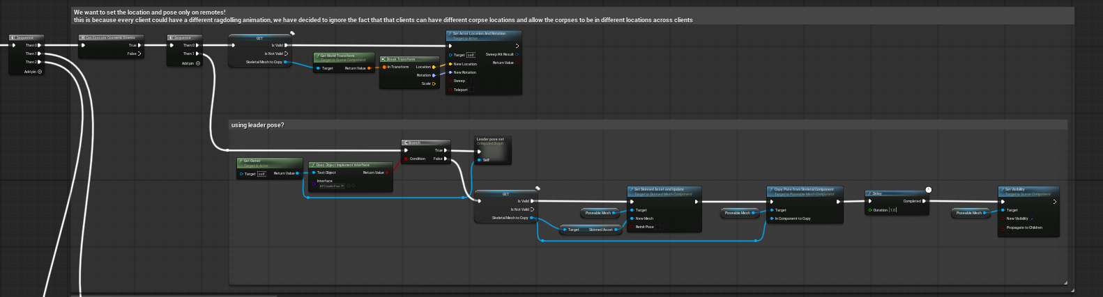 - For remote contexts, the actor sets its location and rotation from the copied mesh transform. The supplied note explicitly accepts that client-side ragdoll outcomes may differ, so different clients may perceive slightly different corpse locations.