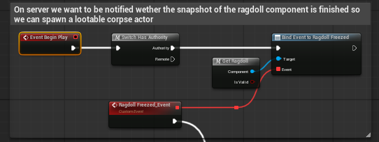 Figure 3. AC_Lootable_Corpse Begin Play binding to the ragdoll frozen event on the authority path.