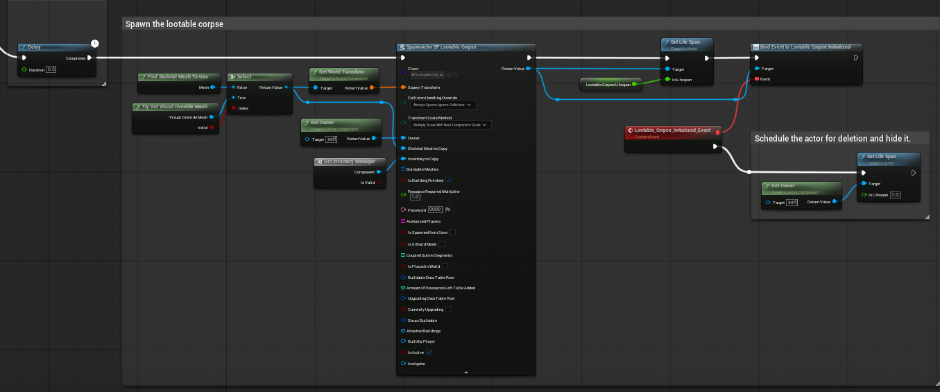 Executes after the ragdoll freeze signal, waits a short delay, resolves the mesh to use, and spawns BP_Lootable_Corpse with the owner and inventory references. |