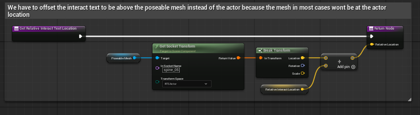 - Get Relative Interact Text Location calculates the prompt location from the poseable mesh so the prompt appears above the corpse body rather than the actor origin.