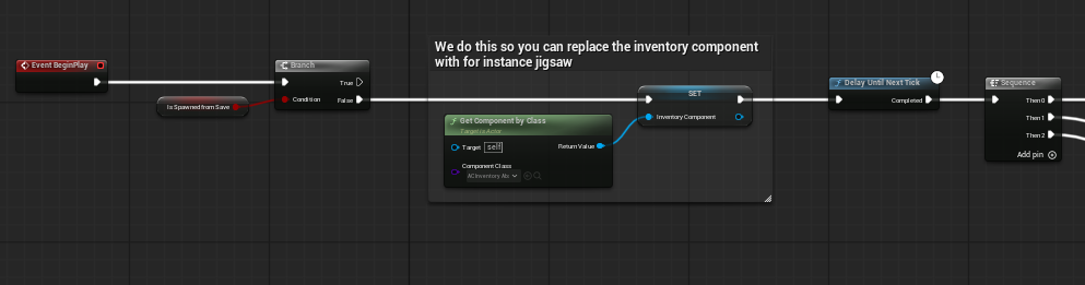 Figure 8. Early Begin Play setup: inventory component resolution and transition into the main initialization sequence.