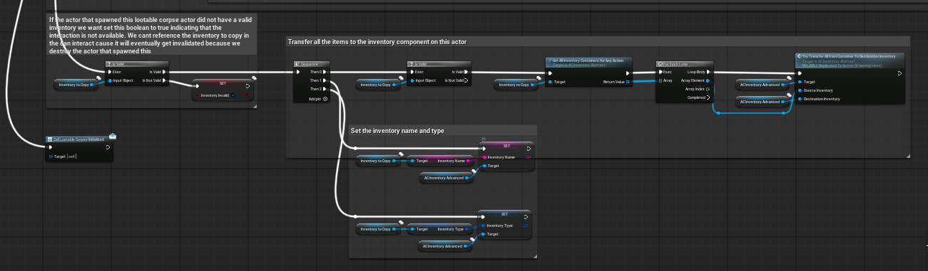 Figure 10. Begin Play inventory validation and transfer into the corpse inventory component.