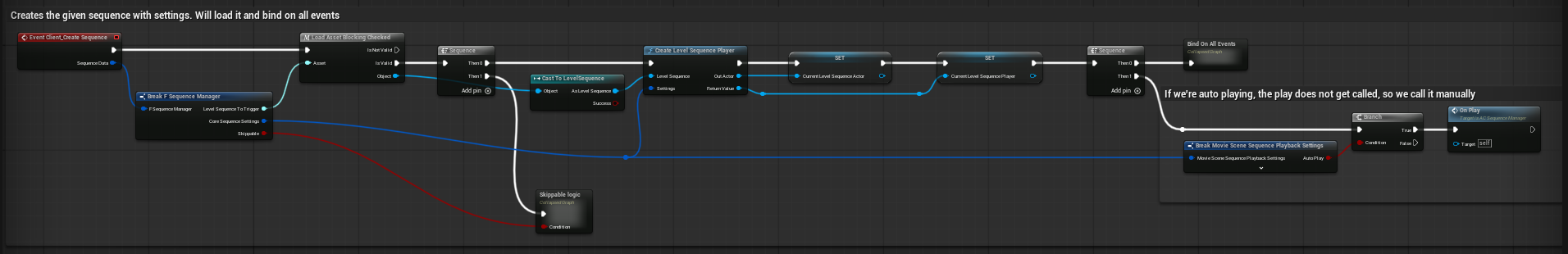 Client Create Sequence is the main entry point. It receives F_SequenceManager, loads the requested asset, creates the Level Sequence Player using the supplied settings, stores the resulting actor and player references, binds playback events, and optionally sets up skip support.