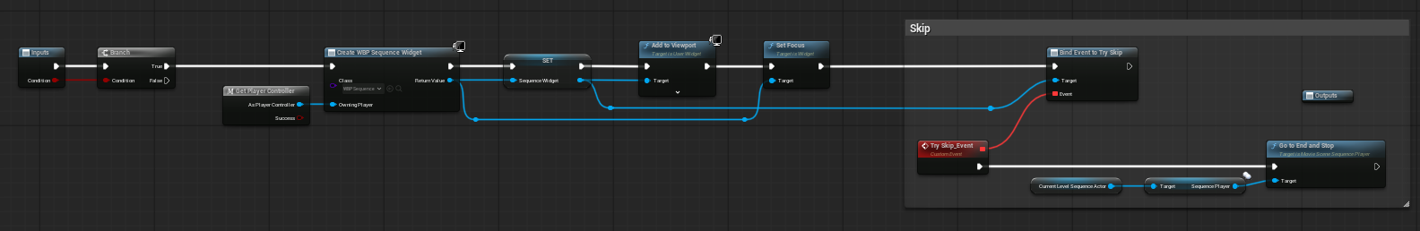 The manager includes a dedicated skippable path controlled by the Skippable boolean in F_SequenceManager. When the value is true, the component creates WBP_SequenceWidget, adds it to the viewport, gives it focus, stores the widget reference, and binds its Try Skip event.