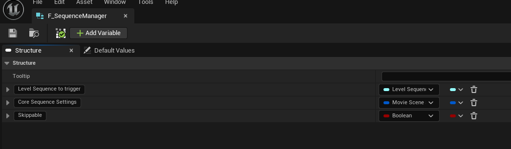F_SequenceManager contains the sequence asset reference, playback settings, and skippable toggle.