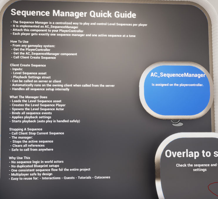 The Sequence Manager is a centralized Blueprint component used to play and control Level Sequences on a per-player basis. Instead of placing sequence logic directly inside world actors, triggers, or one-off Blueprints, the system moves playback into a single manager attached to the Player Controller.