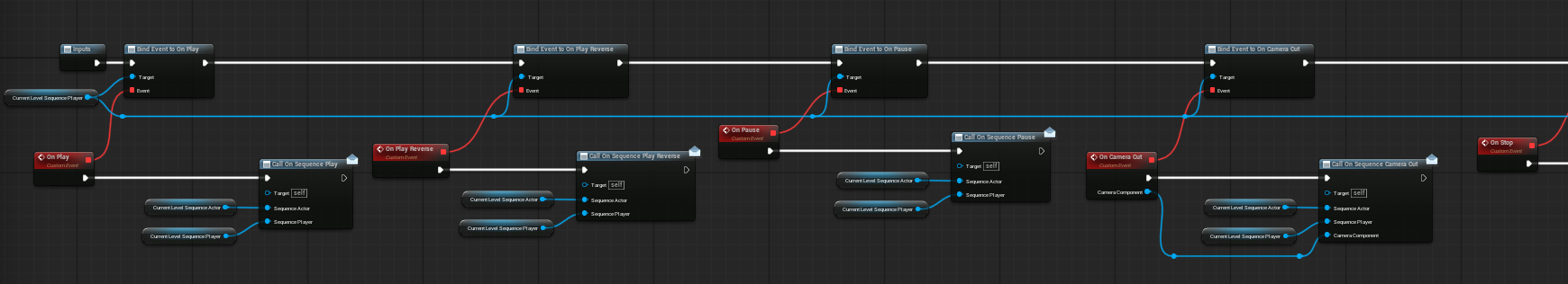 Bind your project-specific logic to the manager's callback layer rather than directly to each created sequence player. The graphs show that the manager already forwards play, reverse, pause, camera cut, stop, and finished. That makes it the best place to hang UI, quest progression, or interaction-state logic.