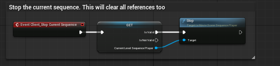Client Stop Current Sequence is intentionally small. It validates the current sequence player reference and then calls Stop on it. This makes stopping easy from other systems while allowing the manager's own stop and finished callbacks to own the cleanup path.