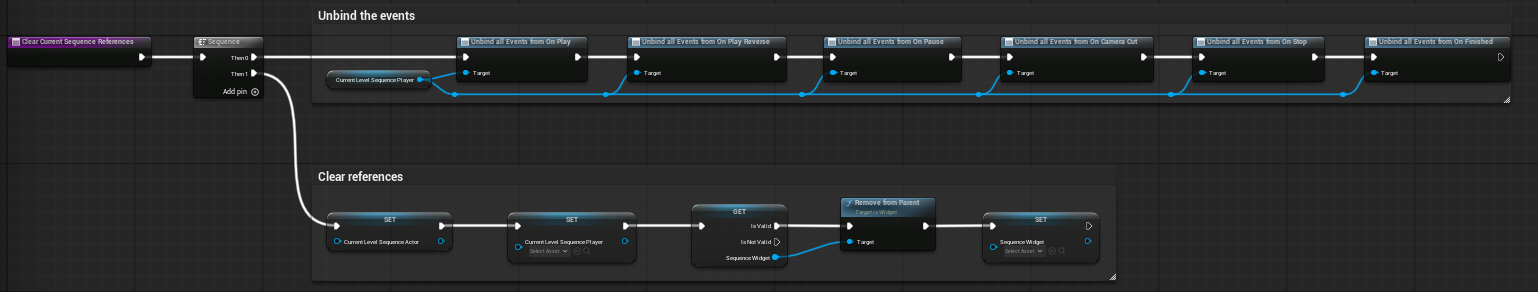 Clear Current Sequence References unbinds events and clears actor, player, and widget references.
