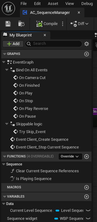 AC_SequenceManager overview showing the public event graph, runtime variables, and helper functions.