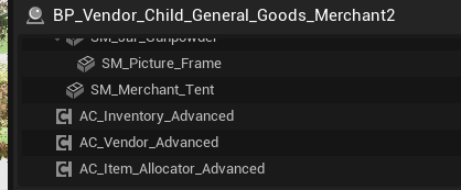 The AC_Vendor_Advanced component handles all trading functionality. Add this component to any actor to make it a vendor.