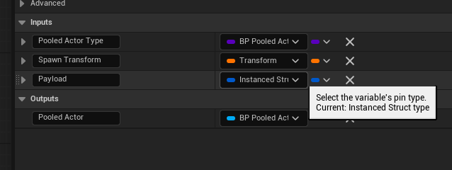Spawn From Pool accepts a Payload input of type Instanced Struct. This is an important extensibility point because it lets callers pass structured, per-activation data without hardcoding AC_GS_ObjectPool to a single payload schema.