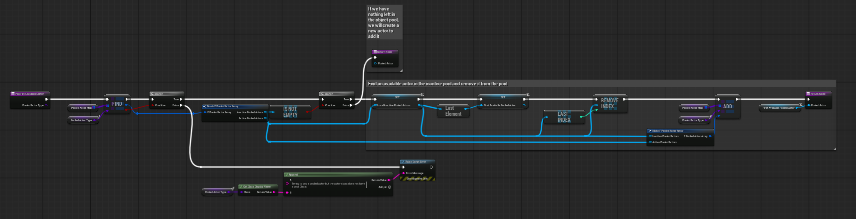 The graph also includes runtime expansion behavior. When the pool exists but no inactive actors remain, the system can create an additional actor instead of failing the request. If the class does not have a pool at all, the graph raises a script error so missing setup is caught early.