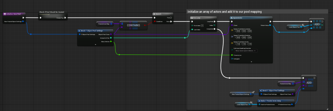 Initialize New Pool first checks whether the current runtime should create the pool at all. If the current machine passes the dedicated/listen/client rules and the class is not already present in Pooled Actor Map, the function loops Amount To Pool times, spawns the requested actor class, assigns its lifetime, and stores the resulting actors in the inactive array.