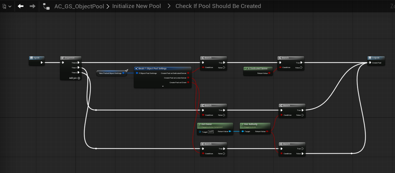 Inside Initialize New Pool, the helper graph Check If Pool Should Be Created evaluates the current runtime context against the three booleans in F_ObjectPool_Settings.