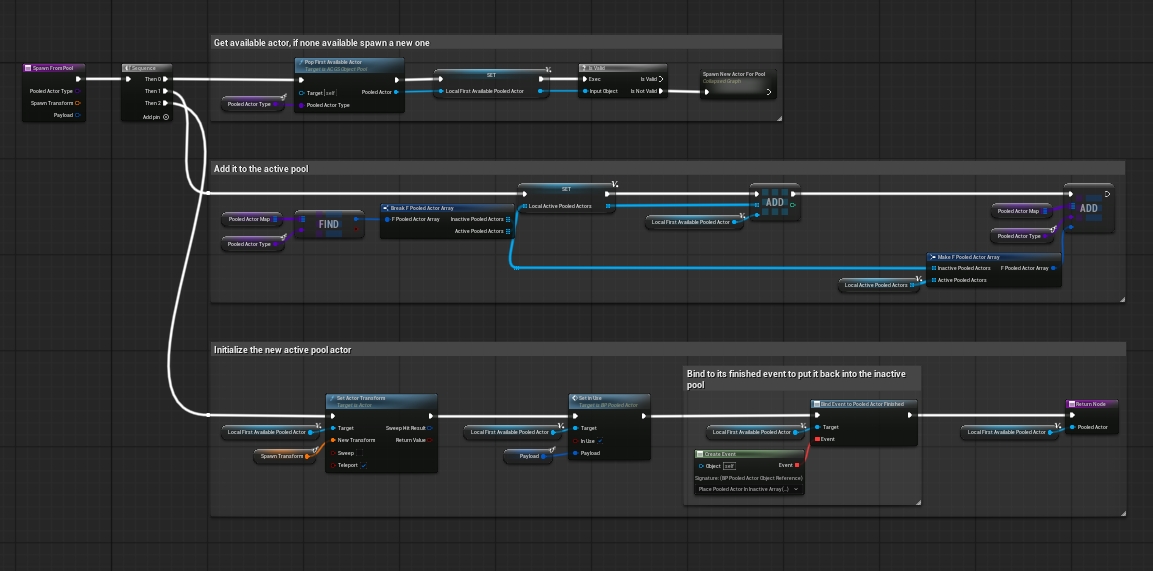 Spawn From Pool retrieves an actor, marks it active, initializes it, and binds the finished event.