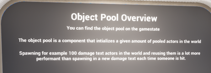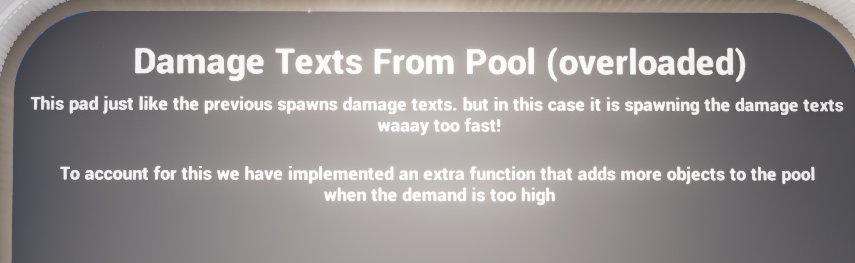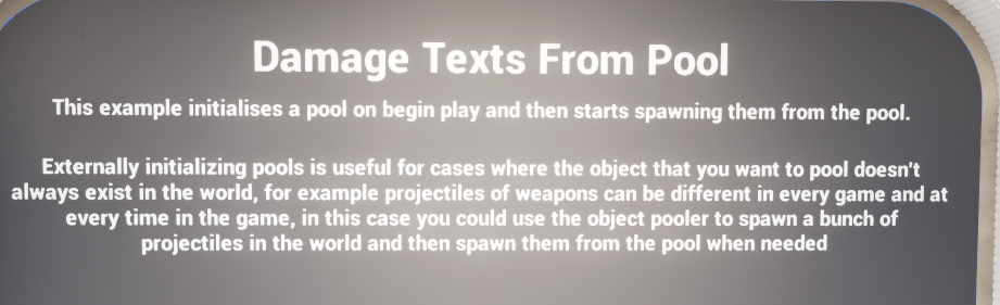 The damage-text example demonstrates a setup where the pool is initialized on BeginPlay and then repeatedly consumed during play. This is a strong fit for floating text or combat feedback where the same actor type may be requested constantly.