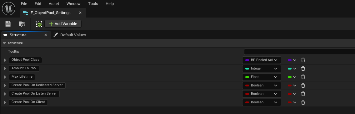 F_ObjectPool_Settings defines a single pool configuration. Add entries of this type to Objectpools To Initialize when the GameState pool manager should pre-build that actor class at BeginPlay.