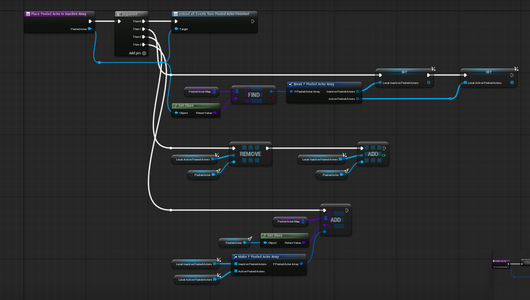 Place Pooled Actor In Inactive Array is the return-side housekeeping function. When a pooled actor finishes, this function unbinds finished-event bindings for that actor, removes it from the active array, adds it back into the inactive array, and writes the updated struct back into the map.
